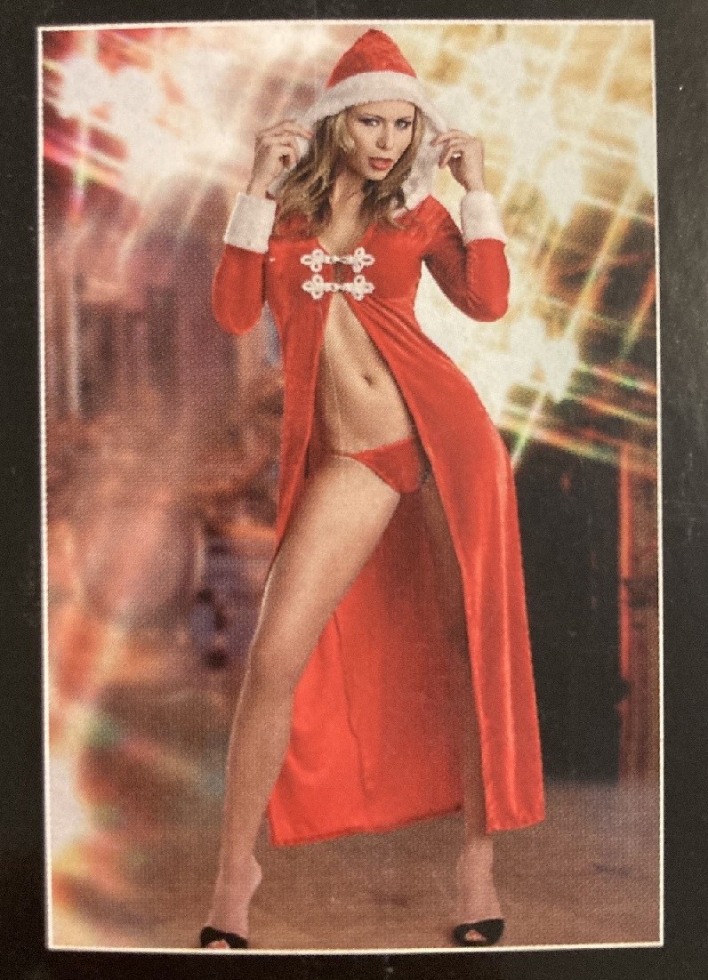 Vključuje dolgo, elegantno božično obleko s privlačnim odprtim krojem in kapuco. Spredaj se zapenja z dvema belima zaponkama, ki dodata klasičen praznični pridih. Videti je prav tako čudovito kot na sliki!